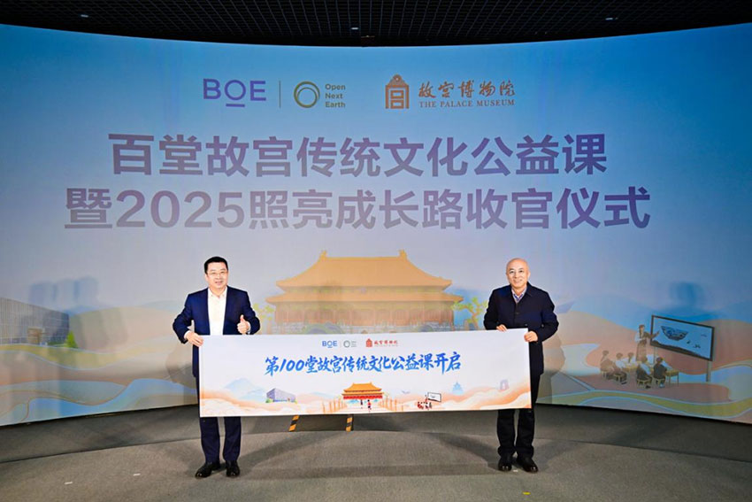 慈善公益报(章昱兴)10月31日,京东方(BOE)“百堂故宫传统文化公益课”暨2025照亮成长路收官仪式在故宫博物院举行。作为京东方的一个开放、多元、可持续公益平台,“照亮成长路”项目已走过10年,故宫博物院是重要的合作伙伴。2023年,双方携手于云南省保山市启动“百堂故宫传统文化公益课”项目,两年时间走进包括陕西西乡、山西娄烦、四川理塘、青海玉树在内的多地近40所学校,线上线下累计惠及学生超过两万名,切实帮助偏远地区学生获得近距离感受中华传统文化魅力的教育机会。